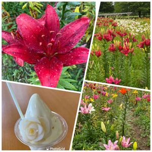 ゆり園に行ってきました🎶 雨が降って来ないうちにと思ったのに、やっぱりダメでした😅☔️💦💦 雨宿りしながらゆりソフト食べました😋 きれいにバラ🌹の形になってる百合根🤍です。上手ね〜💕❣️