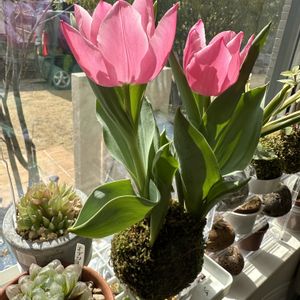 以前投稿の苔玉、鬼の角の様だった2本の尖った芽、その🌷が淡いピンクで楽しませてくれてます😆 外はまだ、芽🌱も出ていない。 花壇で咲く半分ほどの丈です。 球根を2個も仕込んでしまい苔玉の趣きは感じないけど、可愛いピンクに心ワクワクです💓 3週間前にモミジの種を5個埋め込んだら早くも、2本発芽🌱しました! 🌷の為に窓辺に置いていたので、苔の状態はイマイチです。