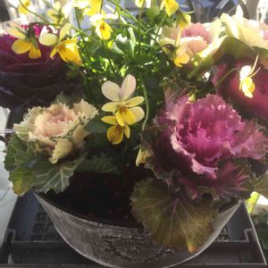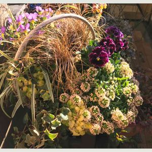 ビオラとパンジーの籠寄せ植えが 満開になりました 満開ということは、もうすぐお別れなので寂しいですが、イメージしたようになってくれて満足です