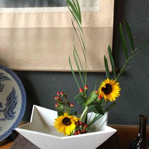 お兄の、生け花。 一晩で、暑さで、葉もカラカラ、 ひまわり萎れ… 昨日写メ撮れば良かったな。 横の花。 華道の、練習です。講義をうけて、持ち帰り、自宅で生けなおします。 暑さで、花はなかなか持ちません ましてや、お座敷床の間は、エアコンなしなので😓