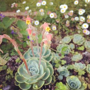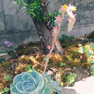 エケベリアの花 キリンソウ ラベンダーラス シドイデス ハツユキカズラ エケベリアの花をアレンジ しました。 奥は押し花のラミネート です♡