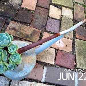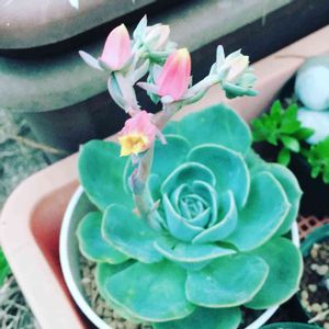 Elmarくんと朝散歩途中(╹◡╹) 多肉ちゃんエケベリア1/2個に2輪 隣の分まで咲いときます(๑>◡<๑)