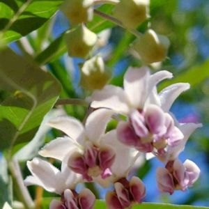 【小葉鴎蔓】《キョウチクトウ科》 花言葉 「地味だが存在感のある」 対生する葉から 翼を広げたカモメを連想した和名 ヒトデのような特異な花で 色も質感も独特 花冠は5深裂し 直径7~9mmで無毛 星型に裂けた花冠は 細長い花弁が裏へやや反り 先が同じ方向に少しねじれている。中央に雌しべと雄しべの合体の芯柱があって、副花冠が囲んでいる。