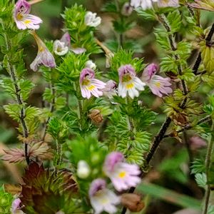 エゾコゴメグサ 🌱ハマウツボ科 コゴメグサ属 ✽白毛が密生する茎は直立して中ほどから対生状に枝を分け、高さが5〜25cmの一年草 ✽密に対生する葉はやや尖る ✽筒状の花冠は2唇形で上唇は2裂し、ときに淡紫色、下唇は3裂する ✽花冠の長さは上唇の先まで約6㎜、内側には紫色の筋と黄色のボカシが入る ③は上から撮ってみました♪