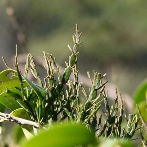 ヒノキバヤドリギ 常緑樹に寄生する宿り木 葉が退化し茎が扁平になり この茎が光合成を行う、半寄生植物。 檜の枝の様子に似ることからの命名 宿主になるのは常緑広葉樹 ツバキ、ヒサカキ、ネズミモチ、ソヨゴ、ヤブニッケイ、ハイノキ、サザンカ、アオキなど 果実は球形でヤドリギより小さく橙黄色、粘性があるのも宿り木と同じ 扁平な茎には節が見える 地域により絶滅危惧種