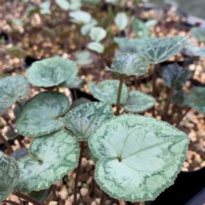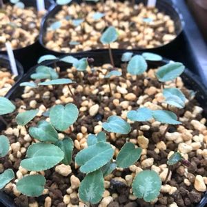 原種シクラメンの実生苗たちが 順調に休眠から目覚めてきました🌱 ペルシカム シルバーリーフですが、完全なシルバーリーフは出なくて モヤっと模様が出ているやつばかりです。 ふふふ、これはこれで綺麗ですな(о´∀`о)