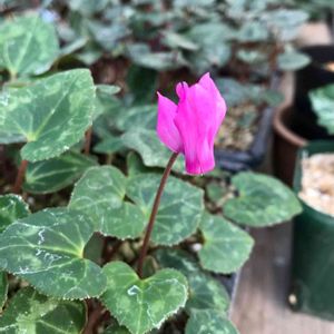 GSで フォローしている方がときどき投稿されているのを拝見し 原種シクラメンにとても興味が湧いていた時に 園芸店で出会ったのが 葉っぱの模様が複雑なペルシカム 現在の園芸品種シクラメンの原点になったのが このペルシカムだそう 「原種」「原点」という響きにも惹かれてお迎えしてしまった 原種の中では耐寒性があまりないので 枯らさないよう大事にしたい