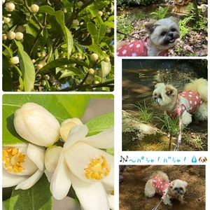 『柚子の花』 この前まで、いっぱい黄色い実をつけていたのに、ふと気づくと、 真っ白な花を🎶❣️ と 🏷️ワンワン祭り 参加させていただきます。 小さな小川のある道をハイキング🥾 平気でジャバジャバ入って行く🐶🤣🎶 水の中に浸かって涼んでいました💧 山道、大好き🐶です😁