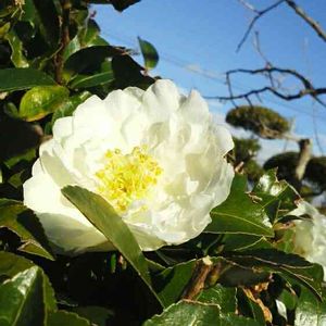 青空が入ると 元気を貰える気がする! 空に向かって 白いサザンカも 輝きを放つ💟─マダム倶楽部No30 白投稿します!