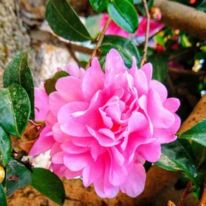 山茶花 ★ 笑顔 背後に見えるピンク色の花と白地に薄紅が入る花が同じ木に咲きます。