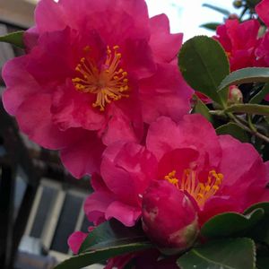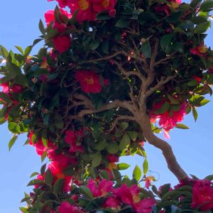 1月なの? ポカポカ陽気☀️ サザンカのお花? 今まで気づかなかったです😅 青空に映えてキレイ😊