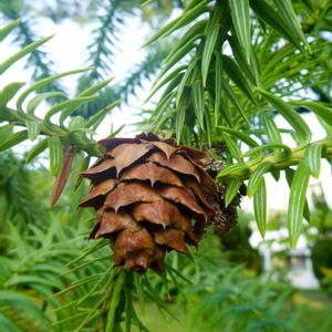 コウヨウザン [広葉杉] ヒノキ科 名前の通り、広い葉の杉。 上が花の後、下が落下した実。 実は厚みのない松ぼっくりのよう💕