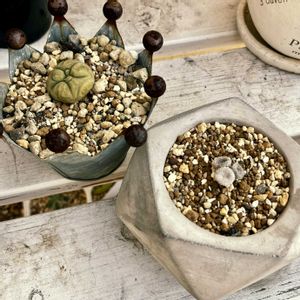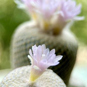 エピテランサ 小人の帽子 実生株 25年2月28日購入 MSE うちに既に少し茶色がかった群生株いますが、まっ白くて安めな実生株売ってたので、買って来ました♪ 1円玉弱位のサイズです。 1,000ペソ