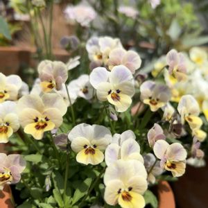 今日も雨☔ なかなか待機苗の植え付けが終わりません💦💦 明日も雨だし、いつになるやら😱 だいぶ片付けが進んでいるパンジービオラですが、まだまだ元気に咲いているの子たちもいます😚 ①伝説の八重パンジーファビュラス 今季は秋が暖かかったおかげで生育が早かった💕 今も立派なお花をガンガン咲かせてくれる優秀なお花です✨ ②パルムディール 最近色変わりをして卵みたいなかわいらしいカラーに🐣 最初は透明感のあるクリアホワイトにうっすらとブルーが入ったおしゃれさんでした😍 ③フロステッドチョコレート🍫 最初に暴れたとかにカットしたので、その後はこんもりとまとまって咲いてます✨ 種が採れそう💕💕 ④シェリルの片思い💘 ライスフラワーの株元にかわいく咲いてます💕 もう花がら摘みもしてないけど小輪なので目立たないしぴょんぴょん伸びて咲く姿もかわいい😍 ⑤ときめきビオラ ララブラッシュ 寄せ植えにしていだけどこの子だけ暴れはじめたので思い切って3月中旬に植替え&切り戻し✂️ 今とってもこんもりときれいに咲いてます💕💕 種が採りたいビオラに限って全然膨らまない😱 お片付けはまだまだ時間が掛かりそうです💦
