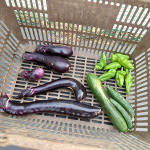 今朝の収穫です🥒ナスとピーマンはかなり茂っていたので剪定し、キュウリはまだ収穫が見込めそうでしたが、秋冬野菜の準備で片付けました。今朝は比較的涼しかったです☁