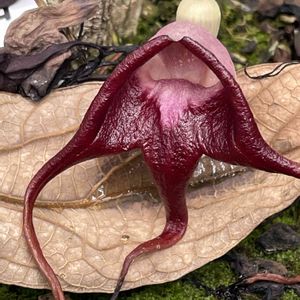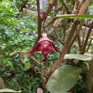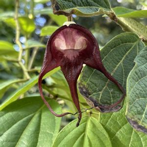 アリストロキア・トリカウダタ Aristolochia tricaudata ウマノスズクサ科ウマノスズクサ属 メキシコ原産 ⚠️有毒植物 大好きなウマノスズクサ科の植物です。捕虫袋を持つネペンテスの様ですが食虫植物ではありません。一応🌼(笑)です。 花弁は無く花びらの様に見えるのは萼片だそうです。花粉症🤧の私には幸い感じませんでしたが、虫媒花で腐敗臭を放ちハエを誘引して受粉させるみたいです。 ウマノスズクサ属(英名:アリストロキア属)だからこやつもジャコウアゲハの仲間の幼虫の食草になるのかな?ということは有毒植物🤮 花友さんから頂いたうちのアリマノウマノスズクサはまだ落葉して茎だけになっとります💦 アストロキアギガンテア(19.9/11)と同じ仲間です。