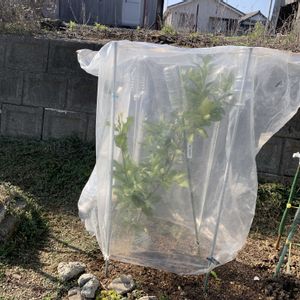 私のグリーンガーデン防寒対策です。 昨年定植したレモン(ユーレカ)にはビニール袋を被せました。 スナップエンドウ、グリーンピースは不織布で覆いました。