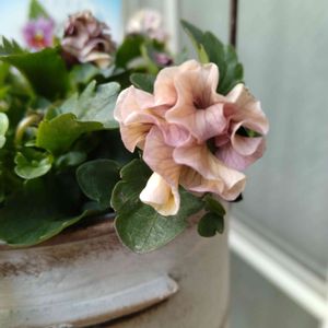 種まきっ子が控えてるし、 今年はもうビオラは買わないって 言っておきながら…😂 一昨日、ちょっと遠くの園芸店まで…🚗³₃ えへへっ( ̄∇ ̄*)ゞ 可愛い子がいっぱい居すぎて 目移りしちゃいました🤭 この何とも言えない可愛らしい色合いに 釘付け👀︎💕︎ うえたビオラ シフォンピーチ🍑💕 かわいくてかわいくて~🤭💕 実は昨日の朝の冷え込みで 早速凍らせちゃったんですが…😨 良かった(*^_^*) 溶けたら元通り😂💦 今夜は玄関に入れて甘やかしてます🤭