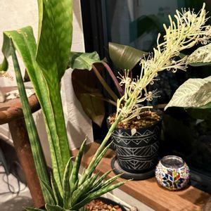 3種のサンスベリアを寄せ植えにしたのですが、フランシシーからお花が咲きました🌸 ダイソー産のスタッキーに親戚のお庭から掘り上げて来た品種不明のサンセベリアとフランシシーの3種盛り