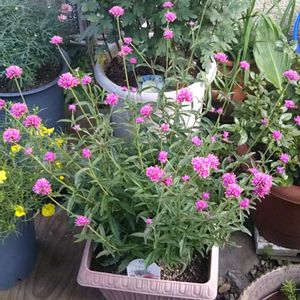 おはようございます😃 ① ゴンフレナ ラブラブラブです。 来月で2年生になる前に ほぼ満開になりました😊 もう少し楽しんでから カットしてドライフラワーにしたいと思ってます☺️ ② アップ写真です☺️ ③ 先日、見切り品コーナーから連れて帰った マリーゴールドファイヤーボールです🔥 実は、撮影後に気が変わりまして 地植え組に転勤してもらいました😅