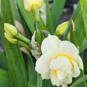 *スイセン* 畑の房咲き水仙が咲いていました。可愛いですね。 2枚目、カリフラワーの様子、葉っぱが見事に鳥🐤さんのエサ。 不織布のトンネルをかけました。💚💚💚