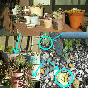 ろろさん宅の南側、(*´罒`*) 写ってないけど、右側にも多肉棚2つ隠れてます(*Ü*)ノ"出来るだけ陽のあたる場所っと 左側は金木犀の木で影やん(๑´• ₃ •̀๑) ルビネさんから花の蕾かなー? やはりまだ居た雑草チラホラの中に 子宝草と ナンタラカンタラ万年草 はい、名前把握してません(´-ω-)ウム