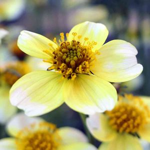 【ウインターコスモス(ビデンス)】 メキシコ原産、キク科多年草 花期になると分枝した茎の頂部に、花径3~5㎝程度の頭状花を咲かせる。 花は中心部分の筒状花と花弁のように見える舌状花からなり、花姿はコスモスに似ている。 ウインターコスモスの名前はこの花姿に由来している。 草丈:30㎝~120cm 花期:10月~1月 花色:黄色、白、複色 山口市内ホームセンター