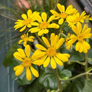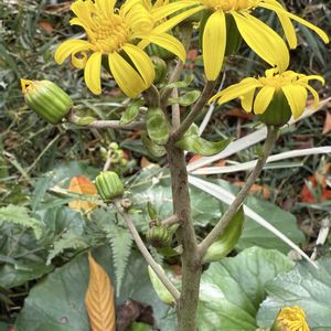 💛黄色の花💛 ①②③石蕗(つわぶき)キク科 晩秋から初冬にかけて開花 直径約5cm前後 昔から 民間薬や食用野菜として使用 ④⑤木立朝鮮朝顔 ナス科 別名 エンジェルトランペット 春から秋にかけて下向きに 垂れ下がった花を付ける 花弁の先端は 5つに分かれ 反り返る🎶 全草有毒植物