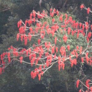 イイギリ(飯桐)の赤い実 イイギリ科イイギリ属の落葉高木 山里のふもとにブドウのように垂れ下がった赤い実を沢山つけた高木がありました。 カメラをズームしてよく見ると、イイギリでした。 イイギリ(飯桐)の名前の由来は、昔はその大きな葉っぱをご飯を包むのに用いたことに由来する。イイギり(飯桐)はキリ(桐)の仲間ではない。キリ(桐)はゴマノハグサ科で全く別のものである。木材として下駄などにも利用されたようなので「キリ(桐)」の名前がついたらしい。別名は果実がナンテン(南天)に似るためナンテンギリ(南天桐)と呼ばれている。 樹皮は灰白色で、表面にブツブツしたものが沢山あるが、ブツブツ以外の部分は大体滑らかで、裂けているわけではない。そのブツブツというのは、「皮目」といって、そこで呼吸が行われている。 開花時期は3月~5月。
