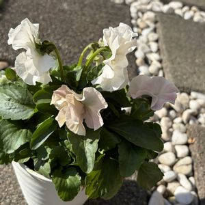 おはようございます😊 大好きなビオラの季節♬.*゚ 今年もいくつか寄せ植え、おひとりさま植えをしました☺️ まずはその一部を🌱𓂃 𓈒𓏸 ① ティアード・公爵令嬢 ② ペルクレア・ヘブンリーブルー ③ぶどうももか・ペニーブラック ④ シエルブリエ・ ⑤ シエルブリエ・なごみももかしんしん・ヘブンリーブルー 後は、アリッサムやストック、ブラキカム、それから庭に育ってるコクリュウやディゴンドラ、元から鉢に植えっぱなしのヘデラや、シレネユニフローラなどをそのまま利用して😉 植えたてなのでまだ寂しいですが、これからだんだんいい雰囲気になってくれると思います💕