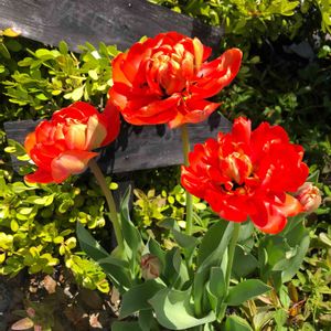 おはようございます😊 八重咲きチューリップ赤咲きました〜🌷🌷🌷 4色いっぺんにと思い植えましたけどなかなか日当たりやらで上手く行きませんでした〜😂 来年は時間差で植えよう❣️
