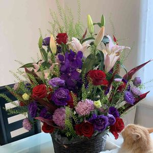 昨日は沢山のお祝いコメントありがとうございました🙇♀️ 皆様の暖かいお言葉にまた胸が熱くなってしまいました❤️ 日に日に寂しさが増しています。 用事で来る娘が帰ってしまう事がまだまだ受け入れられないですけど、皆さん通る道ですよね😂 お祝いで頂いたアレンジお裾分け凄く豪華で綺麗です。💐 ニャンコが飛んで来てチェックしてます🐱