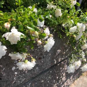こんにちは〜😊 週末ですね💕 今日は薔薇の消毒をと思い万全な格好で始めたのですが噴射機の先が壊れてしまい途中で断念💧ホームセンター行かなきゃです😢 ミニ薔薇ちゃんホワイトだいぶ咲いて来ました〜。🌼 石垣全部這わせたいのですが、横になかなか増えていきませ〜ん。