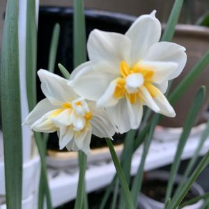 おはようございますo(^▽^)o♡ 今日の私のお花さんは八重咲き水仙のお花さんです🌼♡♡ 🏷️ 白い貴婦人✨ 🏷️ 花咲く乙女たち♡ パラパラと雨が降る中、花壇を見に行くと八重咲き水仙が半分くらい咲き初めていました٩(๑❛ᴗ❛๑)۶♡🌼♡♡ 茎のわりにお花が重たいので大雨になる前にカットして、花瓶に入れ飾りました♪(๑ᴖ◡ᴖ๑)♪✨✨ お花さんは土が1番好きなのだとわかっていたのですが😂 家の中で少しでも長く咲いて欲しいです🤗♡♡✨✨✨♡♡♡