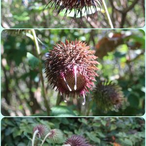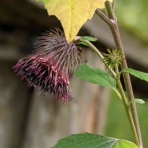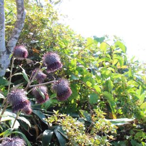 オヤマボクチ(雄山火口) *キク科ヤマボクチ属 花期は9〜11月 北海道西南部〜岐阜県まで、四国.九州の山地の林縁や日当たりの良い草原に生える。 根生葉は 花時期には枯れる。 茎葉は互生し 縁には鋸歯がある。 頭花は全て紫褐色の筒状花! 硬い総苞片には くも毛がある! 根を漬物にしたり、葉をヨモギの代わりに使われたり、利用されています。 地域特産品として利用する為栽培も行われている地域もあるようです。