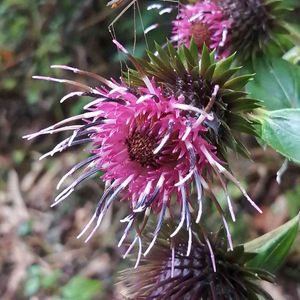 オヤマボクチ、ミステリアスな花。小花は紫色~赤紫色の花冠、全て筒状花で外側から開き外側の小花から退色する。 花柱はピンク色で先が2裂し、葯は暗紫褐色(後に退化して淡褐色になる)で花粉は白。 🤔なかなか説明と実像が結び付かず・・・ひたすら見つめる👀〰️💓 蕎麦のつなぎとして活躍するらしい😋🍴