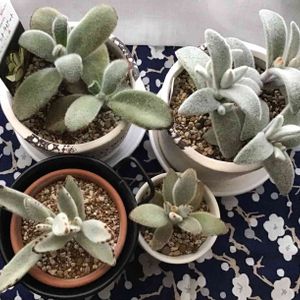 冬越しのため室内組になった うちのウサミミーズ4種 着古した厚手のフリースガウンのようなフカフカな福兎耳 ジャイアントラビットがゴワゴワで固いのはお店で長いこと売れ残っていたせい? 左下は名前不明のウサ耳 シュッと長い耳(葉)で星も月兎耳より多め 黒兎か黒兎耳? と思ってたけど なんだかしっくりこない🤔 このシリーズ、素焼きの鉢だとあっという間に水が抜けて葉がパスパスになってしまうので早く植え替えてあげたい