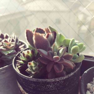 リメ缶のセンペルビウムメルクールも元気です。緑緑した缶だなぁ。 右手前の子は朧月で良いのでしょうか?