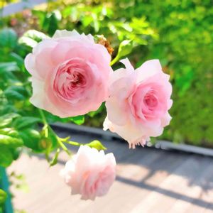 「食と緑の空中庭園」 暑い暑いと下ばかり向いて歩いていたら目の前につるバラが🌹 薄いピンクが美しかったです💕