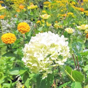 こんにちは☀ 湘南地方、窓のサッシがアツアツ🔥8月もしばらく暑そうですね😅 「食と緑の空中庭園」 アナベルと黄色いお花たち 緑に囲まれて爽やかでした🌼🌼🎶
