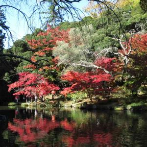 青空映える水鏡😊 まだ青いモミジが紅く染まるとどうなるだろう😊