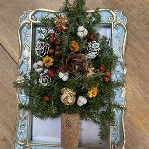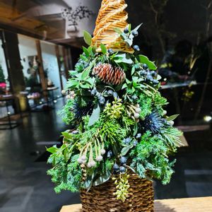 今月のアレンジ教室はツリー🎄でした とてもシックな色合いで麦藁の帽子がアクセントです 松ぼっくり エリンジウム ユーカリの実 ギンコウバイ シルバーブルーニア 樅木等 ギンコウバイの実がとても可愛い💕