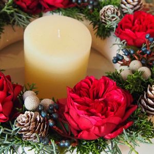 こんにちは〜♪ 師走らしい寒さになってきました 北風が強くて 体感温度1度🥶 🌹ルイスキャロルでクリスマスアレンジ🎄✨ ドーナツ型の器に庭のヒノキ ビバーナム イヴプライスの青紫の実がポイント♡ 赤いバラはクリスマスの雰囲気上がりますね❤️ 午後も暖かくしてお過ごしください♪ ♪︎♪︎(*´▽︎`*)ノ゙