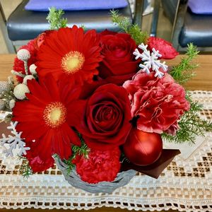クリスマスアレンジメント🌸 今日は、教会⛪️でクリスマス礼拝 友人から頂いたアレンジメントは 鮮やかな赤いお花❣️🥰