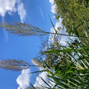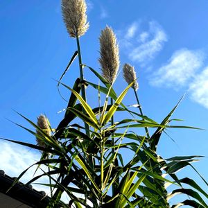 こんにちは( ´ ▽ ` )ノノ☁️☔️ 気温25℃ 蒸し暑いです💦 12時半 【ダンチク】 暖かい地方に生え、竹の仲間のようにみえることからついた。 別名 ヨシタケ 高さ4m 秋の天高く、大きな花穂、お化け👻ススキ🌾 ٩(*°ㅁ°*)ノ ワッ!! 近年では、バイオ燃料の原料として注目され、研究の対象になっているとか… 2024.10月中旬里山にて。