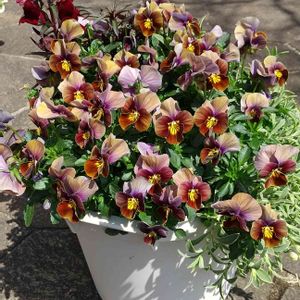 前回投稿してから1ヶ月経ちました。 フロステッドチョコレートの色味が紫強めから黄色?茶色っぽく変わりました~。そして、暴れてます…。 奥の銅葉キンギョソウは、背を低く保ちたかったので切り戻してばかりいたらビオラに埋もれました…💦 シレネ、初めてお迎えしたのですが、こんなに育つんですか?! ひと苗を半分にして植えたんですけど、ビオラに負けないくらい勢力拡大中。 他にスイートアリッサム、ロータスブリムストーン、ネメシアの挿し木がいるのですが、埋もれました💧