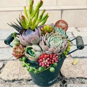 今日の寄せ植え♪ 以前、サボテン🌵をいただいたお礼に 作りました!喜んでくれるといいな😊 Keep Smailingのピック❣️ (あれっ💦写ってない😅) “いつも笑顔でいれますように♪” と願いを込めて😉