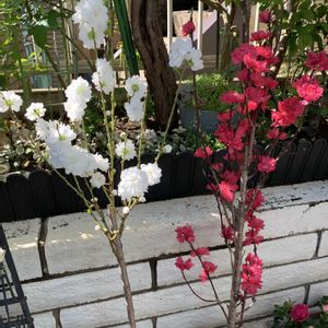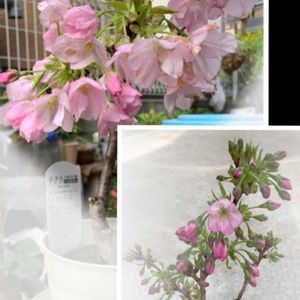 🏷️2025年桜さくらサクラリレー ①我が家の1番小さな旭山桜(50センチ)今日で満開です ②ご近所 ③④スーパーのお花コーナー
