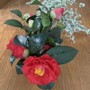 ①ご近所さんが切って持ってきてくれた椿 ②HCに寄ったら買わずには帰れない ③④お迎えした花を植え付けました ⑤お隣りまで勢力を伸ばした立浪草