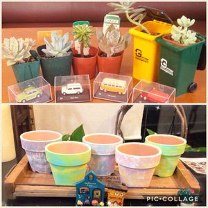 こんにちは(*´◡︎`*) 眠すぎて疲れてるけれどかなり動ける自分がそろそろ恐い😅 昨日、生まれて初めてハルさん師匠様レッスンの元、リメ鉢を作りました😊 全てプレゼント用です😌 たくさんのお友達にいろいろプレゼントしていただき何か恩返しがしたいと思いました😌 一生懸命作りました。 お届けまでもう少しお待ちください😊 レッスンしていただいた師匠様に感謝です🙇ありがとうございました💖 上の多肉さん達は今日、注文していた鉢を取りにガーデンガーデンさんへ💖 鉢を取りに行くだけだよと自分に言い聞かせるが多肉コーナーの誘惑に負けすぐ行く自分😗☝️ しかしなんと狩ったこの全ての多肉さんお値打ちコーナーので全部100円でしたっ😍 これは買いです❤️ 右の黄色とグリーンの箱はダストBOX型貯金箱✨ イエロー✖️ブラック色のコラボが大好きなので1個だけにしようと思いましたが2個で安いんだもんね😅💦 喜んで誘惑にのらせていただきやす!と2個お買い上げ✨ 中が外せたので外して、貯金するお金もないので鉢代わりにしようと思います😆 やっぱりたまにふらっと園芸店見に行かなくちゃ!と思いました😁 き、今日こそ疲れてぐっすりねれるかな😅
